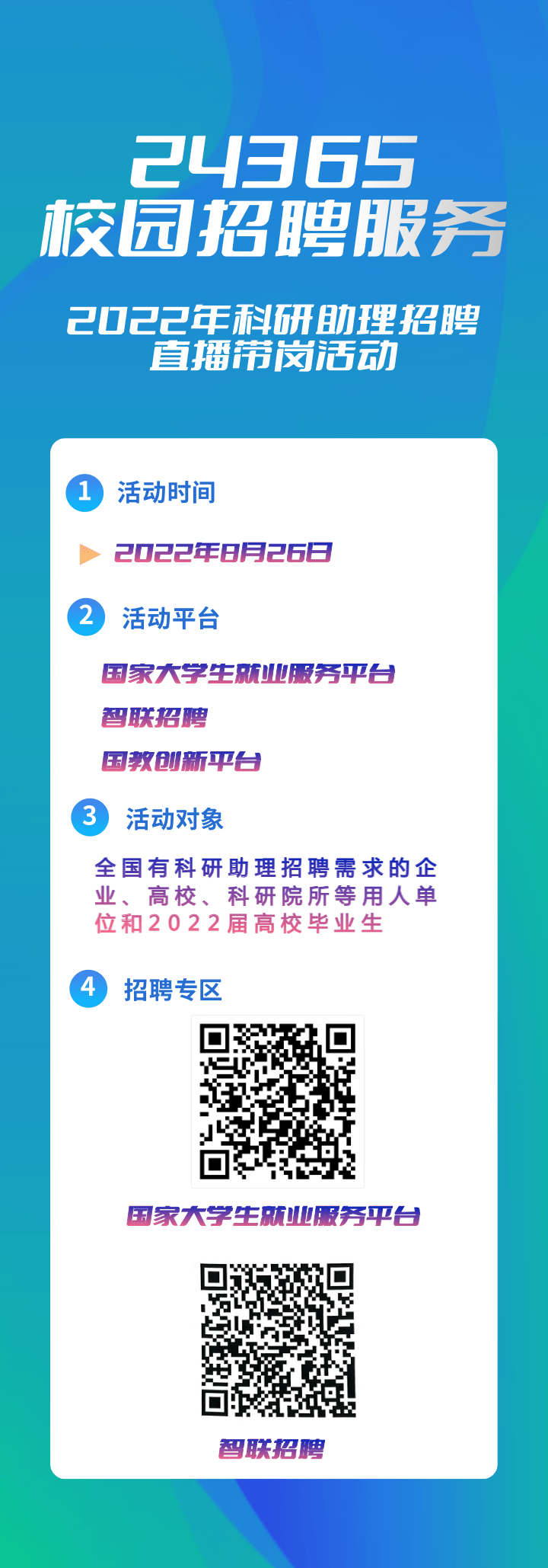 8月26日!“24365校園招聘服務”2022年科研助理招聘直播帶崗活動,誠邀您的參加!
