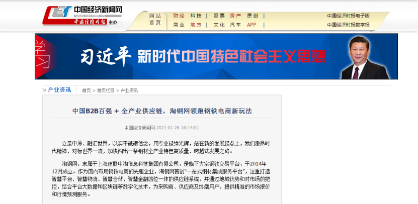 淘鋼網憑借過硬質量和可靠服務,合作了多個“高速公路、地鐵市政、國企事業單位”等項目工程,并先后榮獲“互聯網+創新創業示范單位”、獲多次“中國B2B企業百強"等諸多企業榮譽,網易新聞、新浪新聞、鳳凰網、中國經濟日報網等多家官方媒體相互報道,從此淘鋼網為全國鋼材電商開啟了新征程。