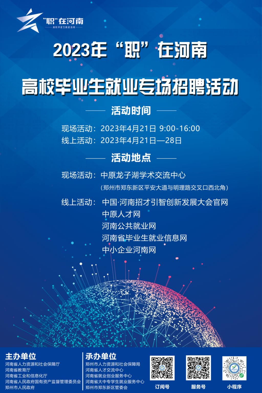 為深入學(xué)習(xí)貫徹黨的二十大精神,全面落實(shí)黨中央、國(guó)務(wù)院和省委、省政府關(guān)于高校畢業(yè)生就業(yè)創(chuàng)業(yè)工作的決策部署,促進(jìn)高校畢業(yè)生高質(zhì)量充分就業(yè),省人社廳聯(lián)合省教育廳、省工信廳、省政府國(guó)資委、鄭州市政府共同舉辦的“2023年‘職’在河南——高校畢業(yè)生就業(yè)專場(chǎng)招聘活動(dòng)”,將于4月21日在中原龍子湖學(xué)術(shù)交流中心啟動(dòng)。