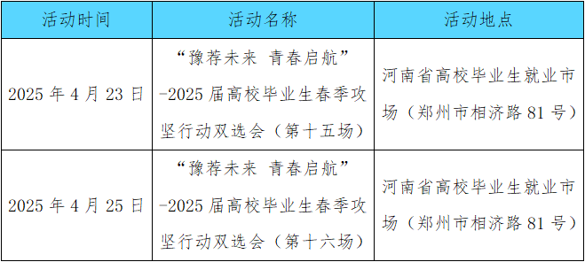4月18日(本周五),河南省高校畢業生就業市場將舉辦“豫薦未來 青春啟航”—— 2025屆河南省高校畢業生“春季攻堅行動”雙選會(第十四場),歡迎2025屆畢業生和往屆未就業畢業生參加!