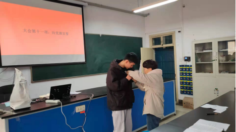 并由學生黨支部宣傳委員范麗霞同志為林小娃同志佩戴黨徽。