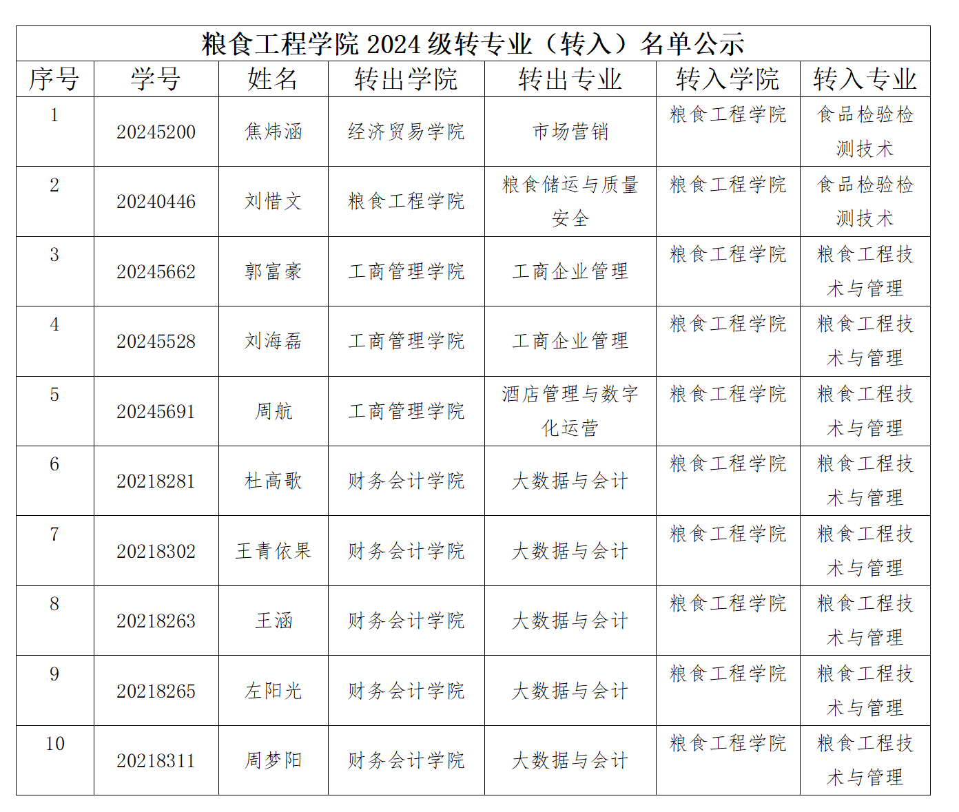 根據(jù)《河南工業(yè)貿(mào)易職業(yè)學(xué)院轉(zhuǎn)學(xué)轉(zhuǎn)專(zhuān)業(yè)管理辦法》(豫工貿(mào)院〔2024〕122號(hào))和《河南工業(yè)貿(mào)易職業(yè)學(xué)院糧食工程學(xué)院轉(zhuǎn)專(zhuān)業(yè)工作細(xì)則》文件要求,我院受理了有轉(zhuǎn)專(zhuān)業(yè)意向?qū)W生的書(shū)面申請(qǐng),經(jīng)過(guò)筆試和面試環(huán)節(jié),結(jié)合各位學(xué)生的綜合情況,我院2024級(jí)轉(zhuǎn)專(zhuān)業(yè)(轉(zhuǎn)入)名單如下所示:
