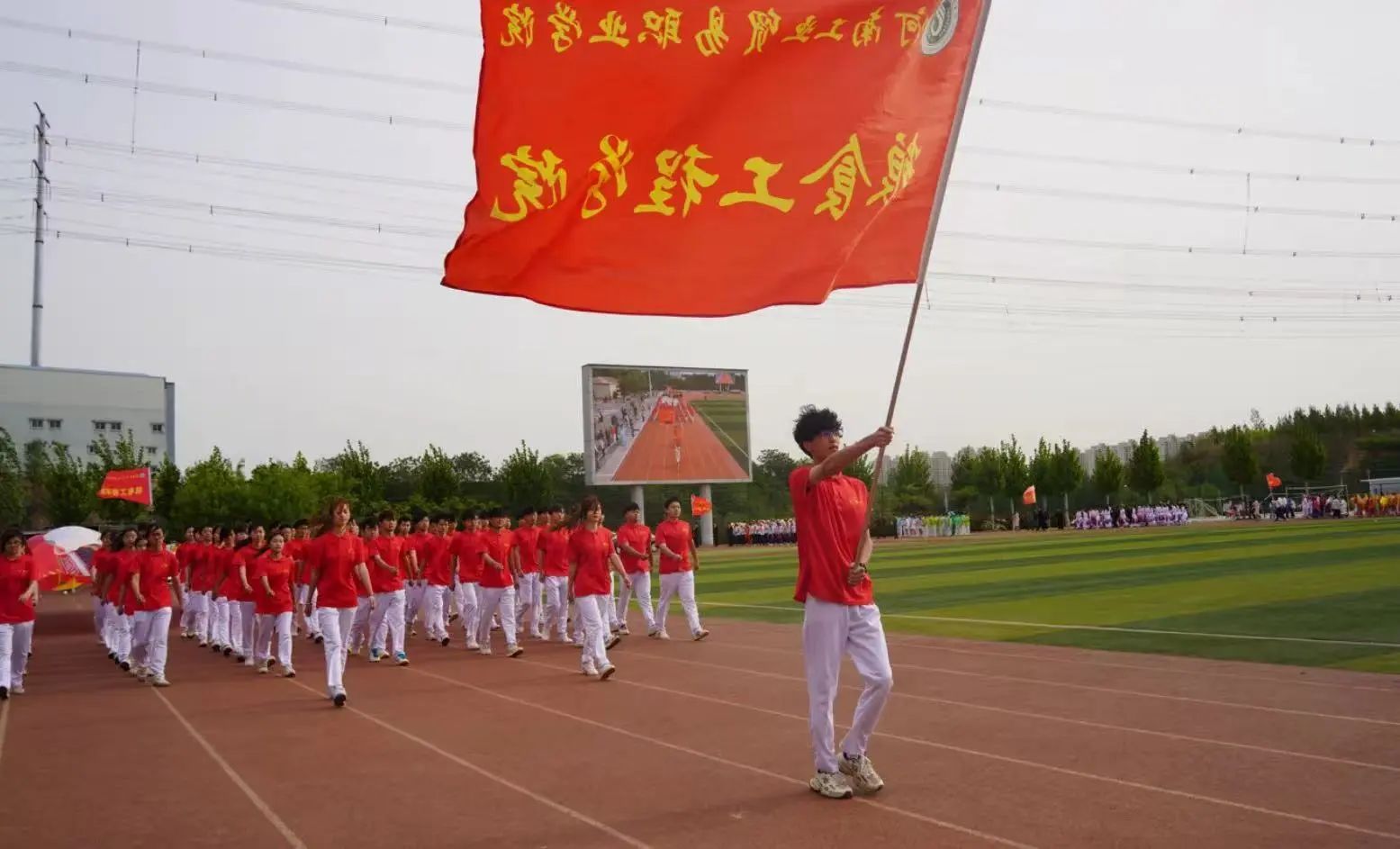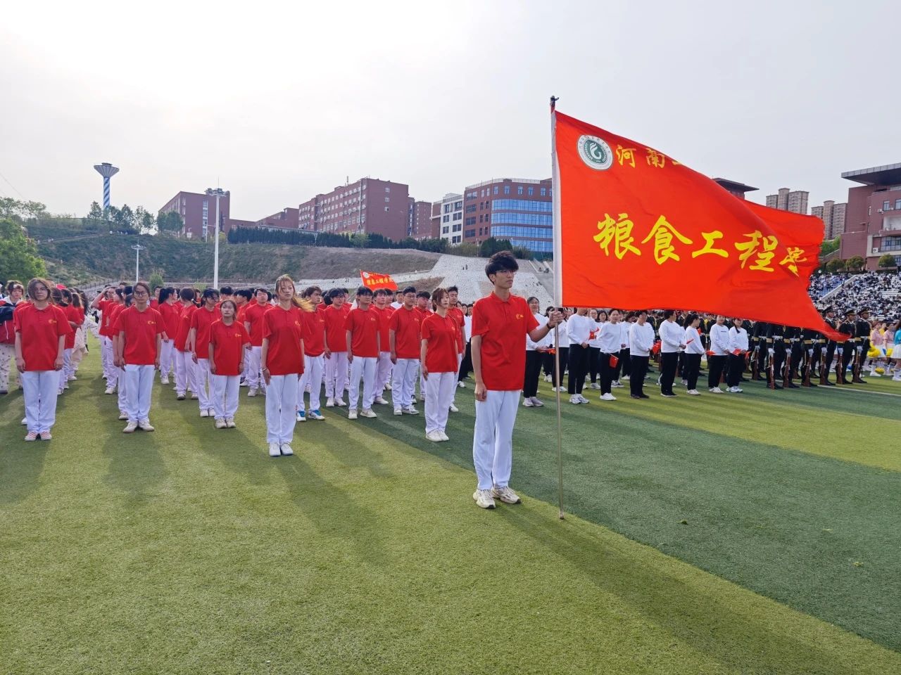 春風(fēng)拂面,旌旗獵獵。2025年4月24日上午八時(shí),河南工業(yè)貿(mào)易職業(yè)學(xué)院第十八屆春季運(yùn)動(dòng)會(huì)隆重開幕。糧食學(xué)院方陣身著紅白拼色運(yùn)動(dòng)服驚艷亮相,服裝背面精心設(shè)計(jì)的麥穗、稻谷圖案彰顯專業(yè)特色。隊(duì)員們踏著《運(yùn)動(dòng)員進(jìn)行曲》的節(jié)奏昂首行進(jìn),在主席臺(tái)前變換出麥穗隊(duì)形,高呼“糧工筑夢(mèng),賽場(chǎng)爭(zhēng)雄,青春似火,氣勢(shì)如龍”的口號(hào),蓬勃朝氣點(diǎn)燃全場(chǎng)。