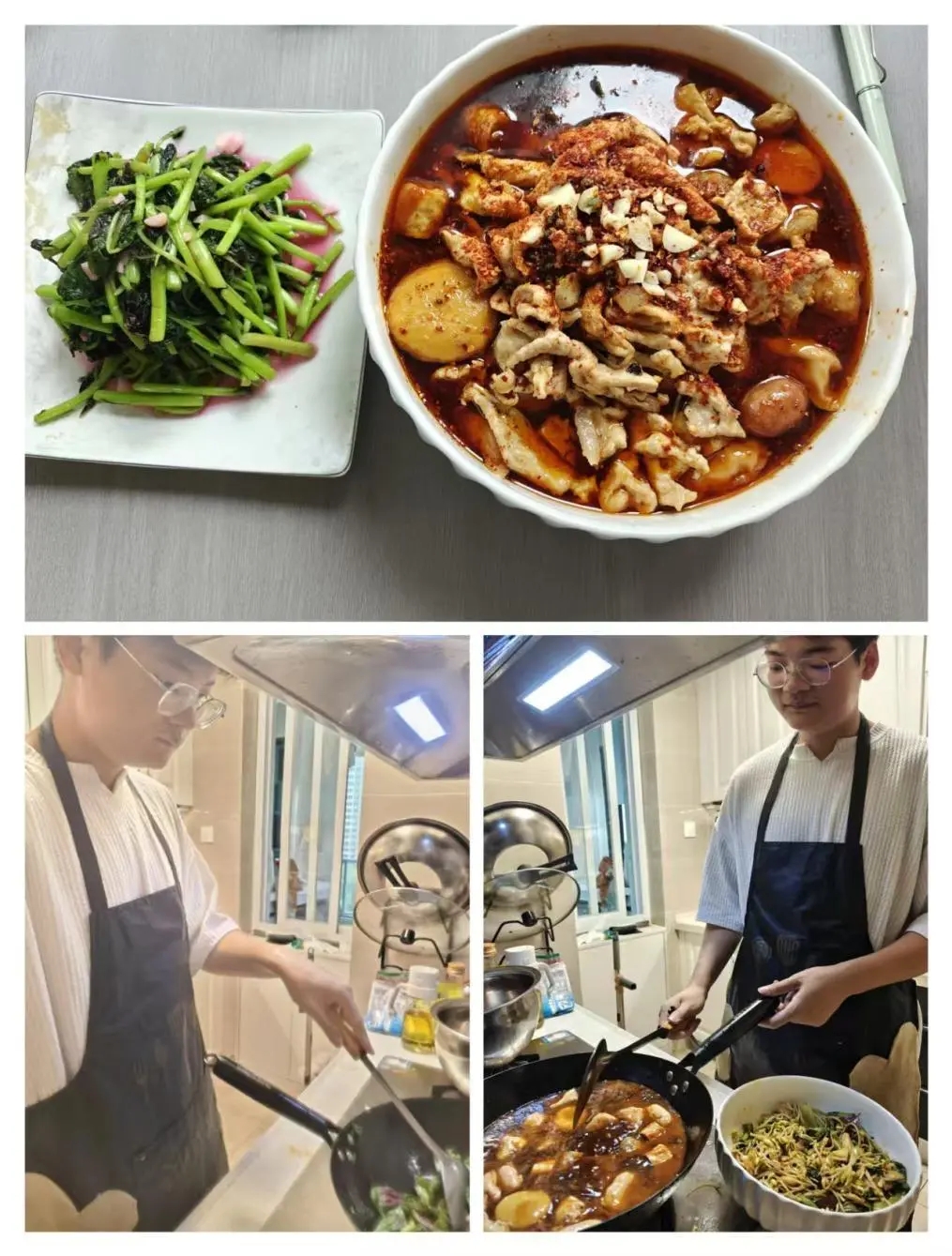 家庭生活技能學習里,學子們收獲滿滿。24食安102班曾海洋投身廚房,開啟烹飪成長之旅。跟著父母學做家常菜時,他經(jīng)歷了從切菜手忙腳亂,到調味精準把控的轉變。油亮誘人的水煮肉片、清爽鮮嫩的清炒莧菜,成為成長見證,實現(xiàn)從“廚房新手”到“小廚神”的蛻變,在煙火氣息里收獲勞動的成就感 。