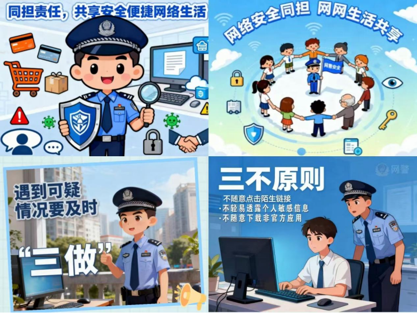 通過公眾號轉載官方相關文章和宣傳展板形式開展網絡安全知識宣傳,點明互聯網便利背后存在數據泄露、病毒攻擊等安全風險,強調網絡安全是需要全社會參與的“必修課”;日常上網要牢記“三不原則”——不隨意點擊陌生鏈接、不輕易透露個人敏感信息、不隨意下載非官方應用;說明遇到可疑情況要及時“三做”:凍結賬戶改密碼、舉報虛假信息和非法鏈接,最后號召大家主動學習網絡安全知識,“同擔”責任、守護“共享”的安全網絡家園。