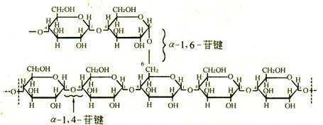 ????淀粉有直鏈淀粉和支鏈淀粉兩類。直鏈淀粉為無分支的螺旋結構,由葡萄糖殘基僅以α-1,4-糖苷鍵首尾相連而成;支鏈淀粉的每條鏈由葡萄糖殘基以α-1,4-糖苷鍵首尾相連形成,但在分枝處則為α-1,6-糖苷鍵。