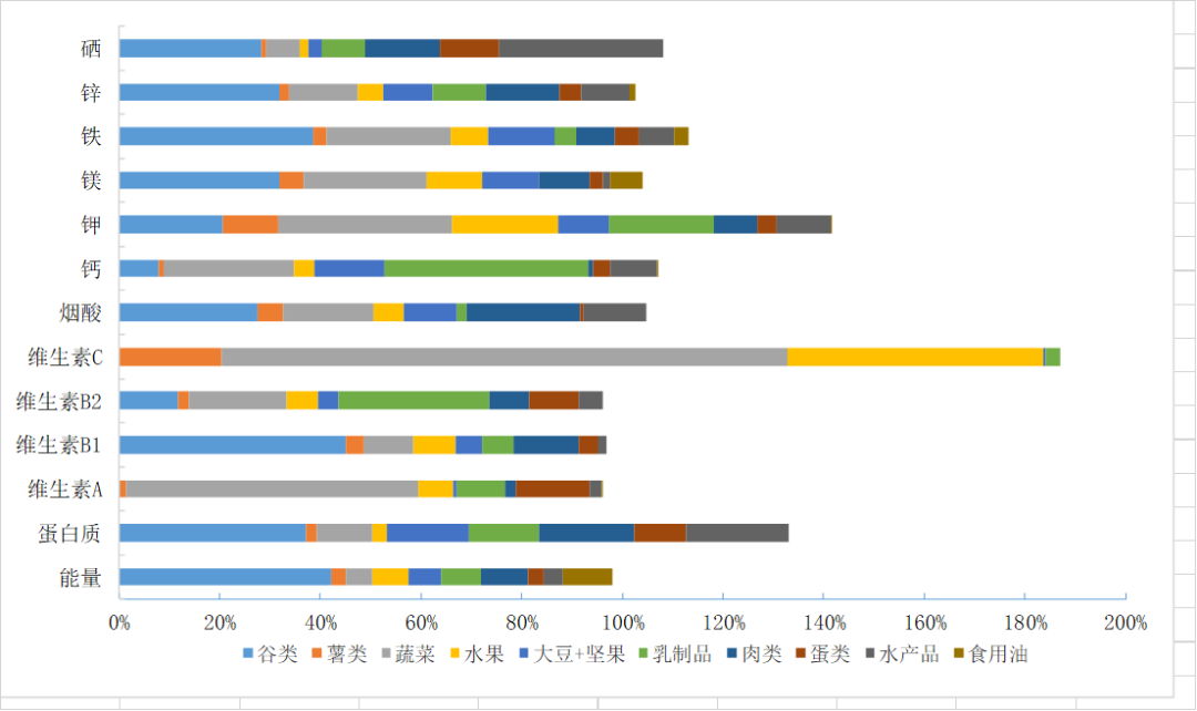 2000kcal能量需要水平下的平衡膳食模式提供的營養素以及占RNI%