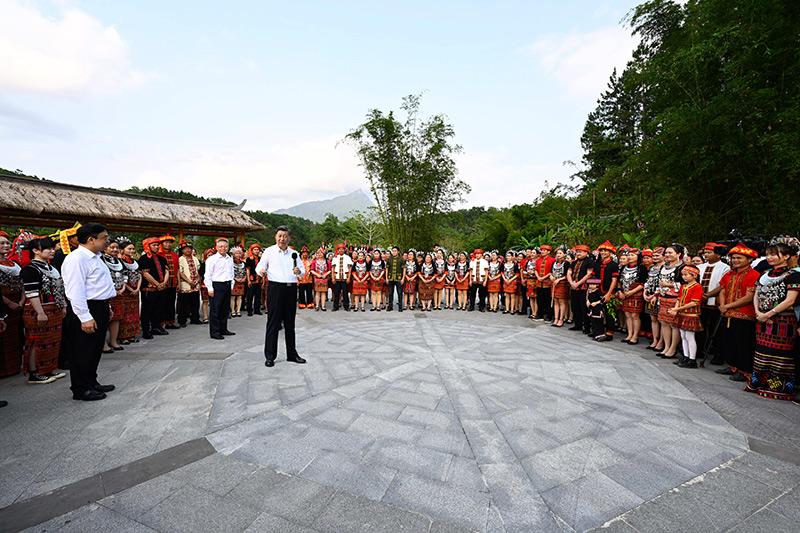 4月10日至13日,中共中央總書記、國家主席、中央軍委主席習近平在海南考察。這是11日下午,習近平在五指山市水滿鄉毛納村同村民們親切交流。新華社記者 李學仁 攝