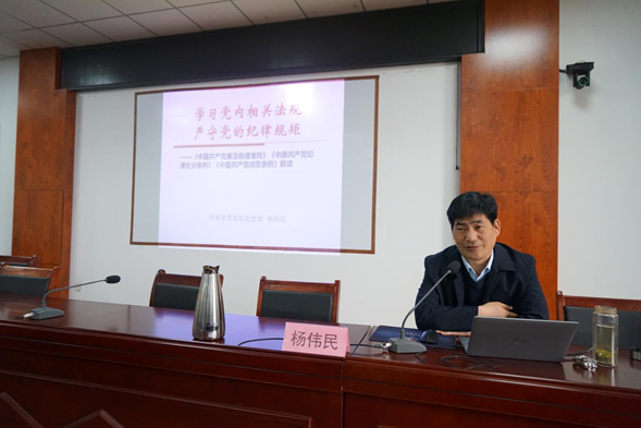 中共河南省委黨校楊偉民教授做了題為《學習黨內相關法規,嚴守黨的紀律規矩》的講座,他結合黨史,分析了《中國共產黨廉潔自律準則》《中國共產黨紀律處分條例》和《中國共產黨問責條例》三項重大黨內法規出臺的背景,講解了準則條例中的重點條文,強調了反腐敗斗爭的嚴峻性、復雜性、艱巨性和長期性,給參訓學員在思想上敲響了警鐘,增強了大家的規矩意識和風險意識,樹立起正確的權力觀、價值觀。