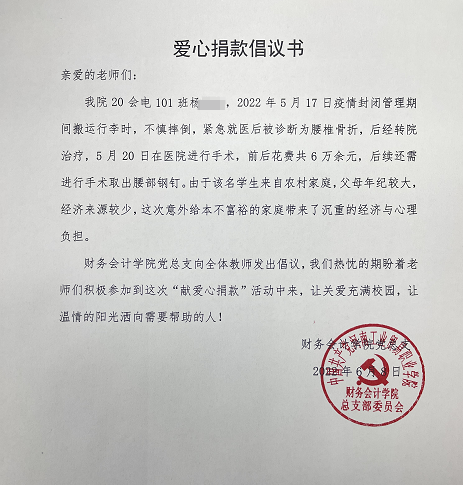 為貫徹落實《中共河南工業貿易職業學院委員會關于印發<開展“能力作風建設年”活動實施方案>的通知》(豫工貿黨〔2021〕160號)精神,切實提高服務群眾的能力作風,引導黨員干部帶頭踐行以學生為中心的發展思想,為學生解決“急難愁盼”的問題,2022年6月8日上午,財務會計學院黨總支組織了愛心捐助活動。
