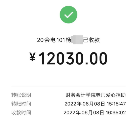 財務會計學院黨總支了解該同學的情況后,立即發起了《愛心捐款倡議書》,在圖書館B8004組織了現場募捐,同時發起線上募捐活動。活動得到了全體專兼職教師的積極響應,老師們紛紛伸出援助之手,短短四個小時的時間,共募集到12030元,并通過輔導員轉賬給該同學。