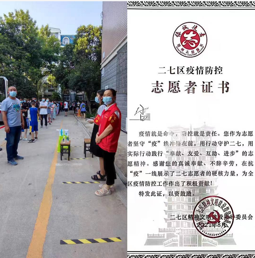 國有令,召必應,在結束所居住的五號街坊社區組織的720洪災的志愿者工作后,7月31日在鄭州宣布新冠抗疫第一時刻,面對轄區被封閉、核酸檢測現場人員聚集的危險狀況,財務會計學院雷啟英老師主動響應社區召喚,加入志愿服務隊伍,協助社區工作人員、物業人員和醫療工作人員順利完成小區960戶業主7次核酸檢測組織工作。所從事的疫情防控志愿工作有:各樓微信防控群的創建宣傳和管理,居民核酸檢測前的布置與組織,檢測中各戶信息核對,檢測后的信息統計與篩查等。雖不是逆行的一線人員,但求用自己的星星之微光,照亮抗疫必勝的一片光!