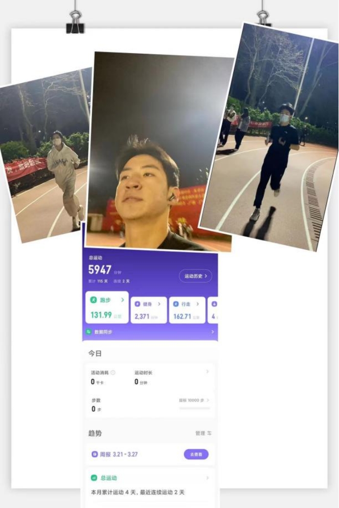本次活動是校團委自去年發起的“青春工貿”系列活動的一部分。受疫情影響,活動以線上運動的形式展開。本次活動中涌現出許多優秀的運動榜樣。藝術設計學院的李甜甜同學在7天時間內完成了共計74.15公里的運動量,21機電102班任智遠同學7天時間內完成了31.51公里的運動量。21機電108張彪同學運動風采,20工商101班周夢臣運動風采大家被這些優秀的榜樣感染著,紛紛表示要合理安排學習運動時間,塑造健康的體魄來迎接挑戰。