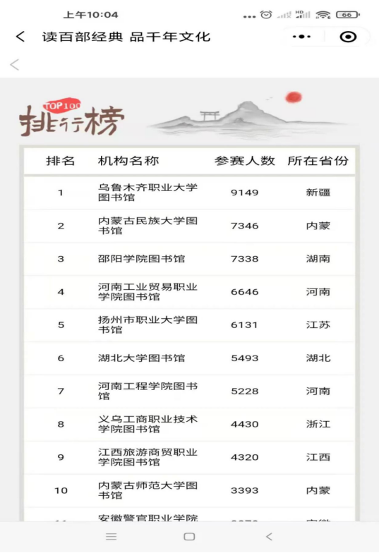 本次活動由“共享悅讀”微書評薦書、“閱讀之星”評選、《百部經典》閱讀打卡、“經典有聲”原著誦讀展示、“百部經典·百題大闖關”傳統文化知識競賽、朗讀者六部分組成。其中由國家圖書館、中國圖書館學會舉辦的“讀百部經典品千年文化”——《中華傳統文化百部經典》校園行活動,同學們積極參加,堅持每天閱讀打卡,讀原著,參與傳統文化知識競賽,截至目前我校參加活動人數共6646人,在全國排名第四,河南省排名第一