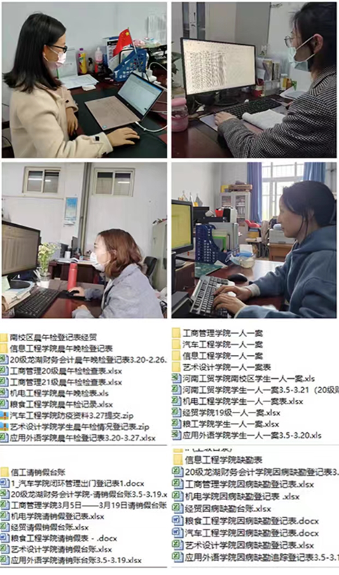 為了能夠及時有效掌握學生動態,精準摸排學生健康情況,各學院疫情防控專員,24小時不間斷地落實好學生常態化疫情防控工作,每天通過釘釘打卡、晨午晚檢、一人一案做好學生健康檢測工作,及時建立學生請銷假臺賬、因病缺勤學生病因追查與登記,時刻掌握學生身體健康狀況,落實落細,發現問題及時上報,及時跟蹤。“工貿學工人”用實際行動詮釋抗疫的決心,在這場疫情大考中,“工貿學工人”考出了逆向而行的擔當作為,考出了師生守望相助的溫度。