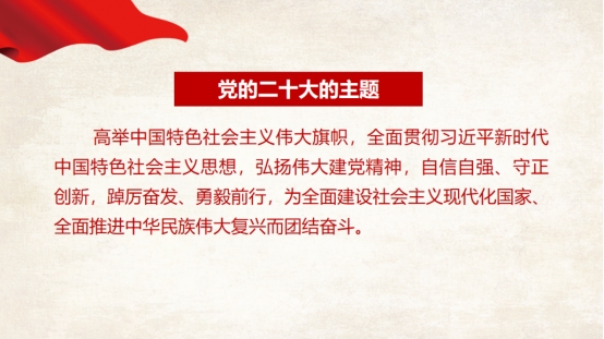 大會主題是大會精神的集中體現,是大會報告的靈魂和主旨,是在向黨內外、國內外莊嚴宣誓:黨在新時代新征程上舉什么旗、走什么路、以什么樣的精神狀態、朝著什么樣的目標繼續前進的重大問題。對于統一思想,動員和凝聚全黨全國各族人民的智慧和力量,同心同德為全面建設社會主義現代化國家、全面推進中華民族偉大復興而團結奮斗,具有十分重要的意義。