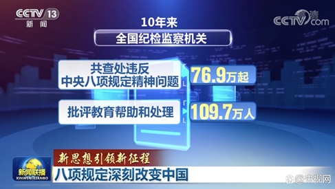 清風勁吹,改變中國。回望過去十年,我們每個人都能看到繩弊糾頑、革故鼎新的新氣象:“會所里的歪風”銷聲匿跡、“舌尖上的腐敗”懲治震懾、“指尖上的形式主義”整治破除……“一分部署,九分落實。”我們形成了落實中央八項規定精神常態化機制,一個節點一個節點堅守,一個問題一個問題解決,黨風政風煥然一新,黨心民心高度凝聚。